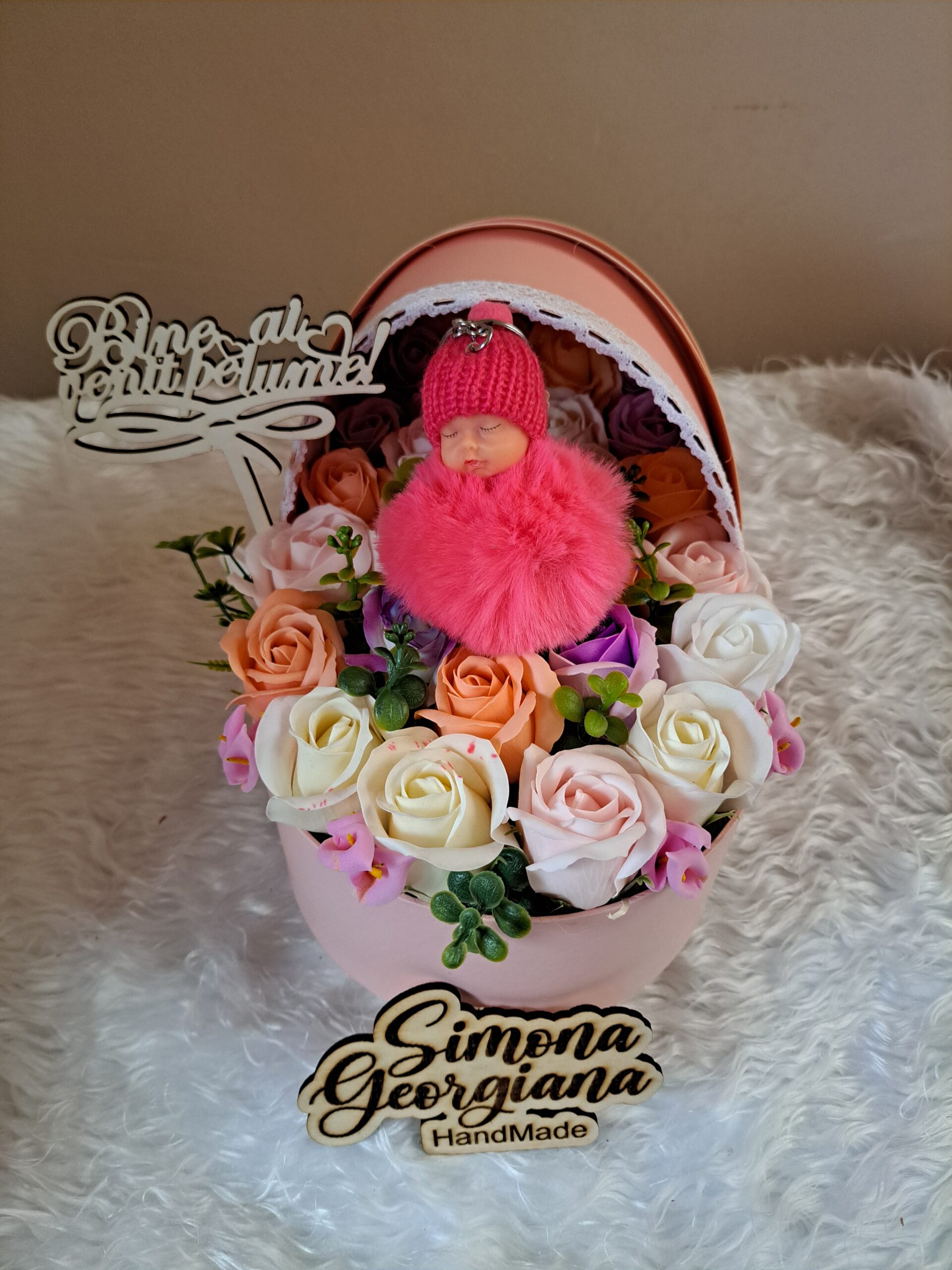 L’ornamento da femminuccia contiene anche un portachiavi con una bambola di peluche e un topper con la scritta benvenuto in questo mondo, scritta in qualsiasi lingua tu voglia