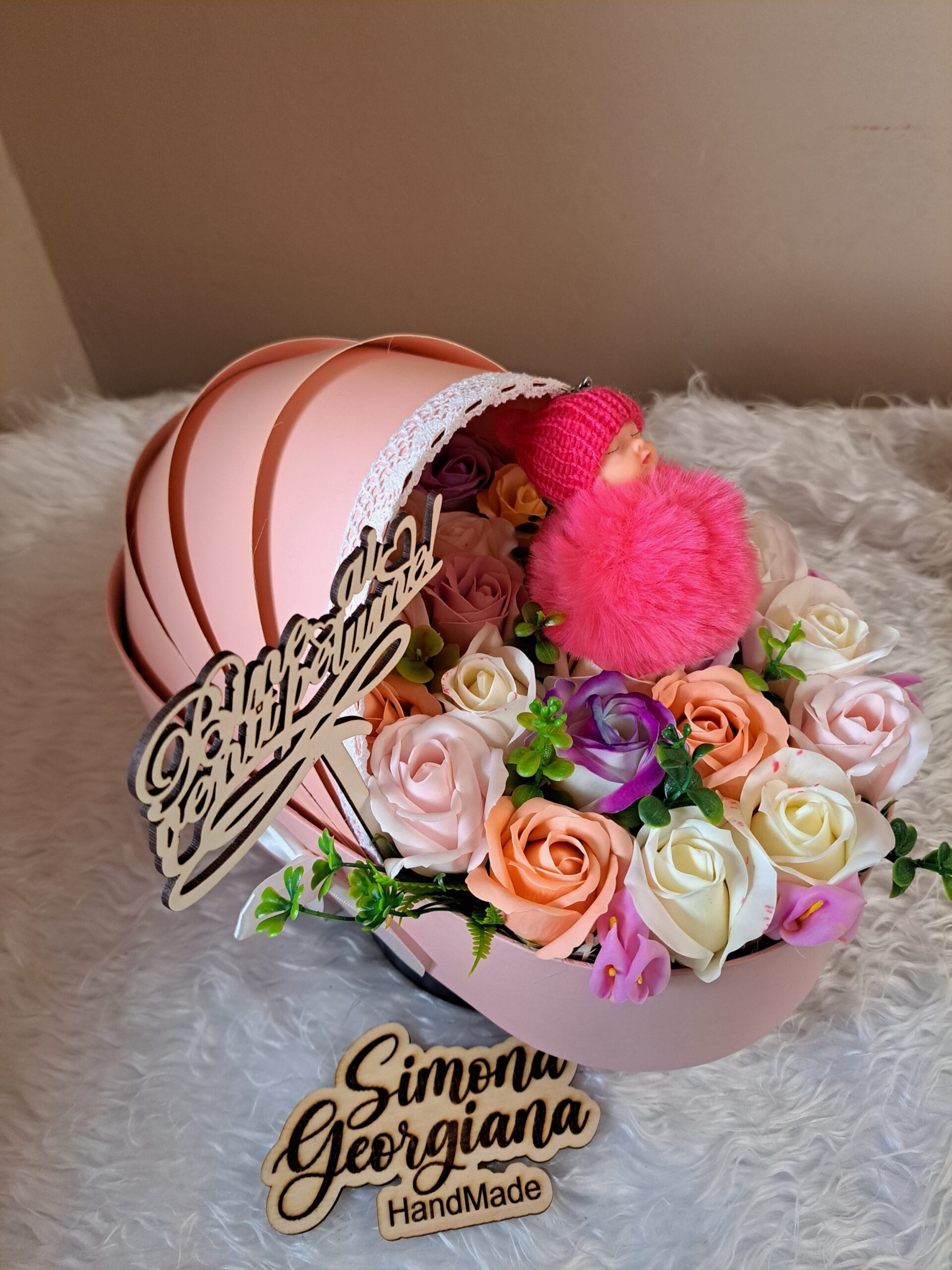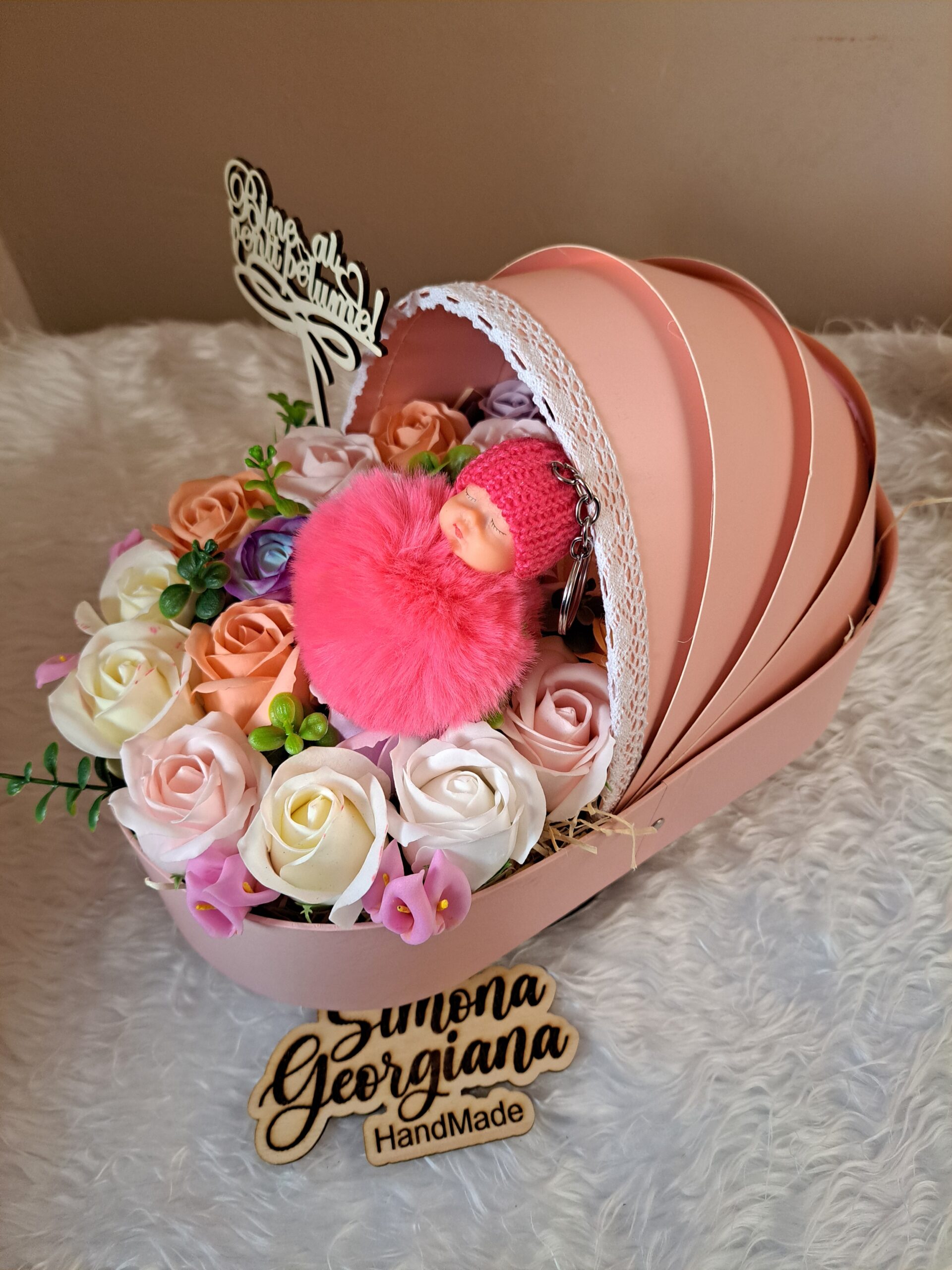 Questo meraviglioso ornamento è decorato con fiori di sapone e può essere il regalo perfetto per una neomamma o per annunciare il sesso del bambino durante un baby shower